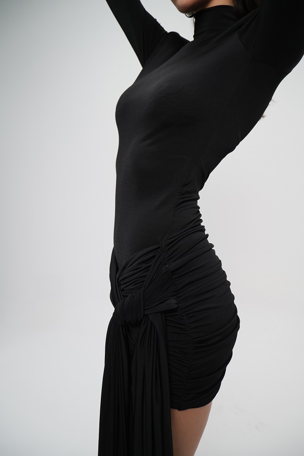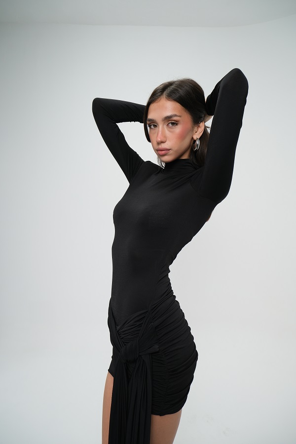 Siyah Uzun Kollu Eteği Büzgülü Yandan Bağlamalı Elbise -ME007S