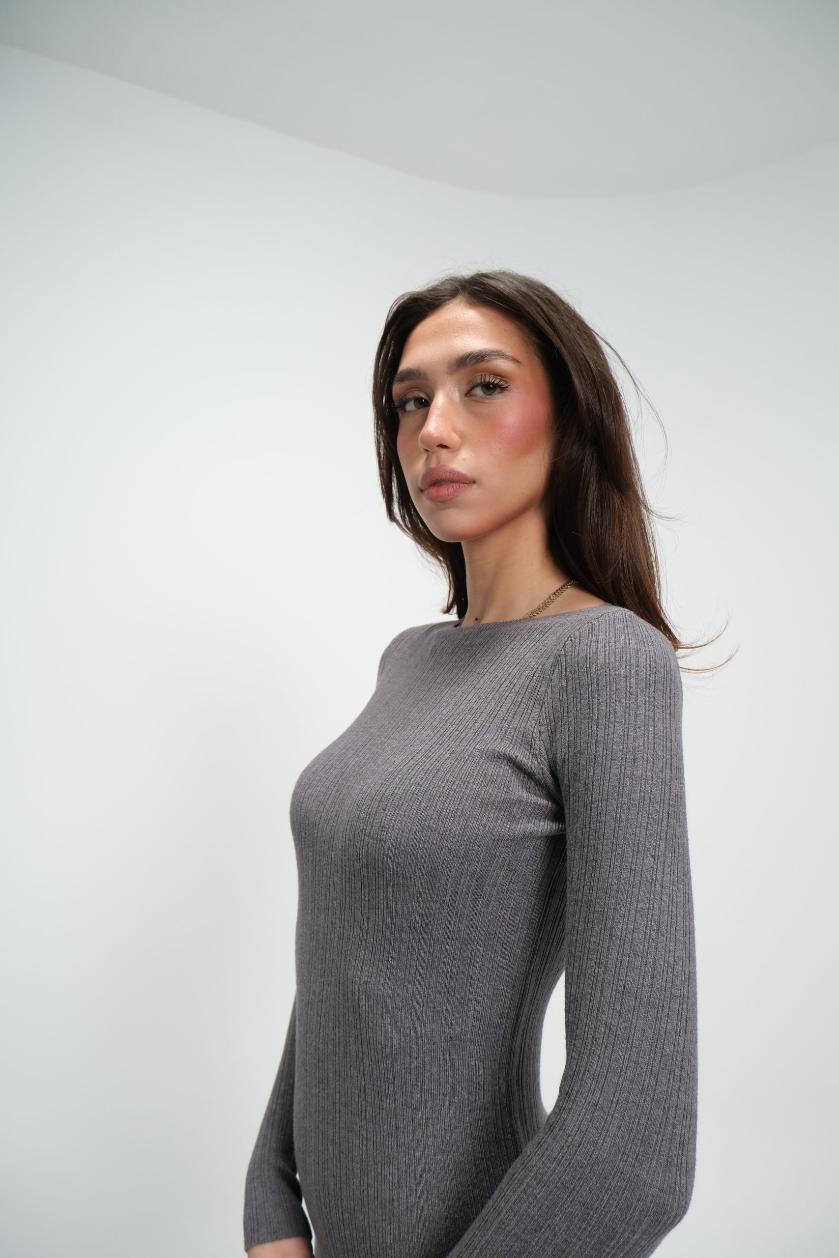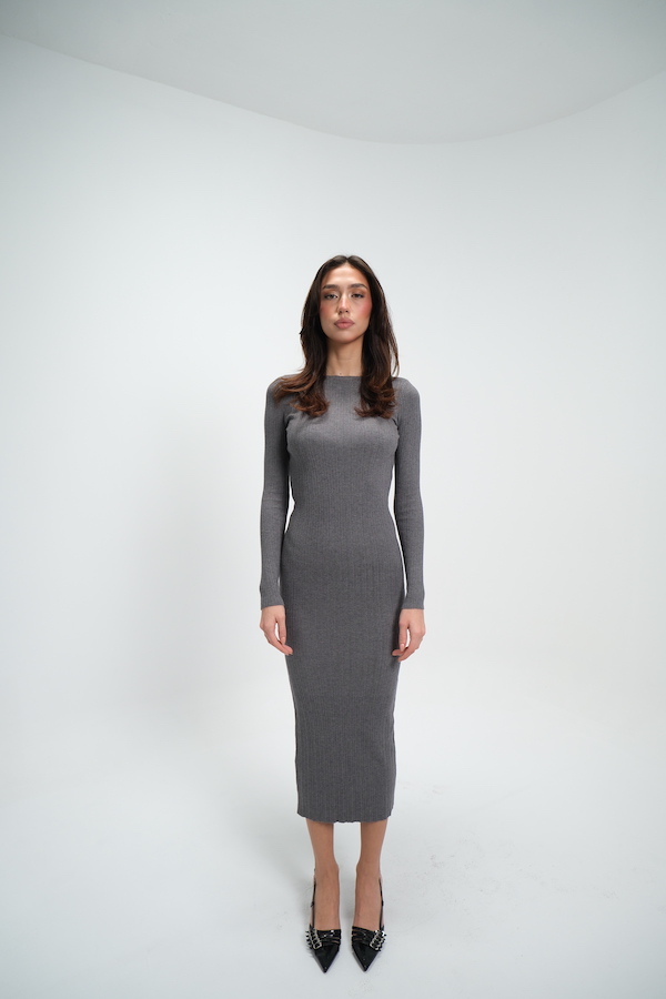 Gri Triko Kayık Yaka Biyeli Elbise – (MTE002G)